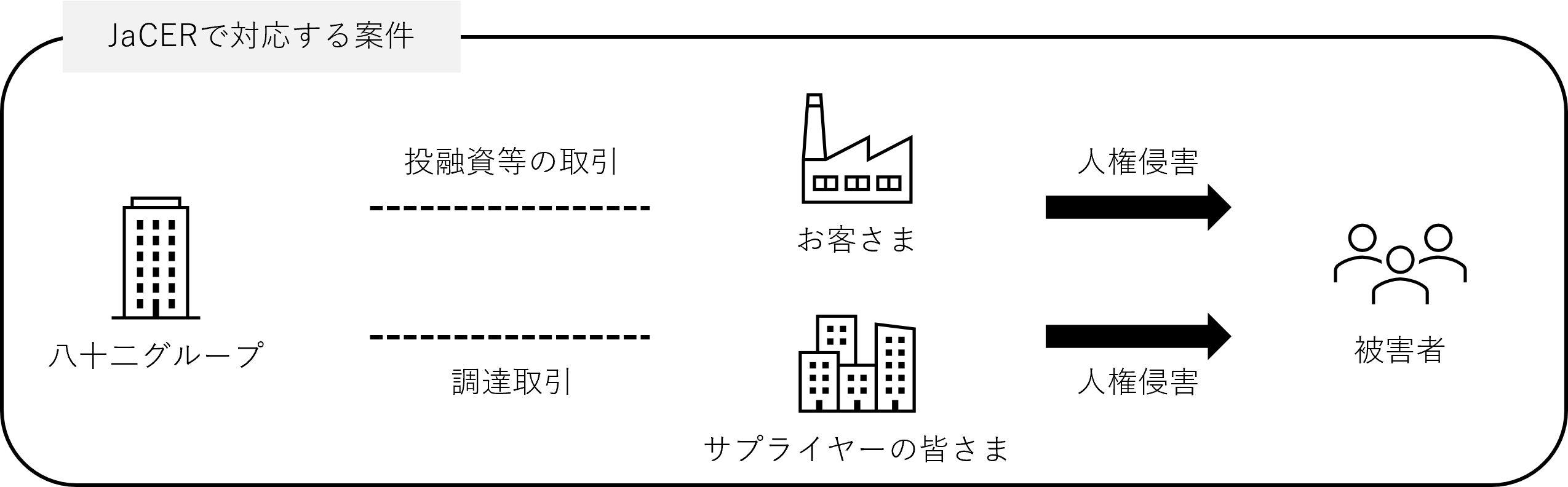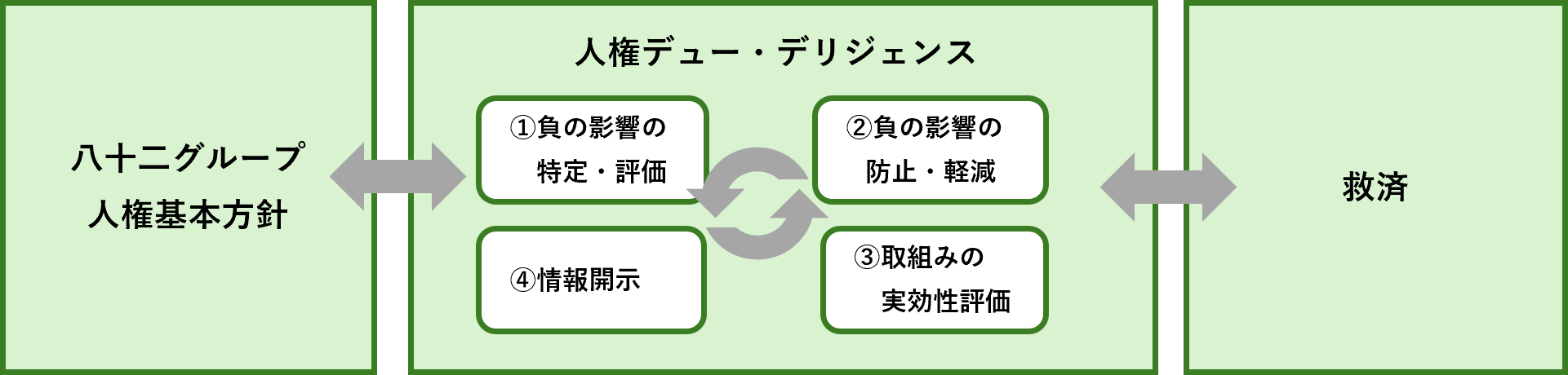 サプライヤーの皆さまに対しても、人権を尊重し、侵害しないことを期待し、別途定める「八十二グループ サステナブル調達方針」のもと、サプライヤーの皆さまが人権に対して負の影響を与えている懸念がある場合には、適切な対応を働きかけていきます。 - 救済
