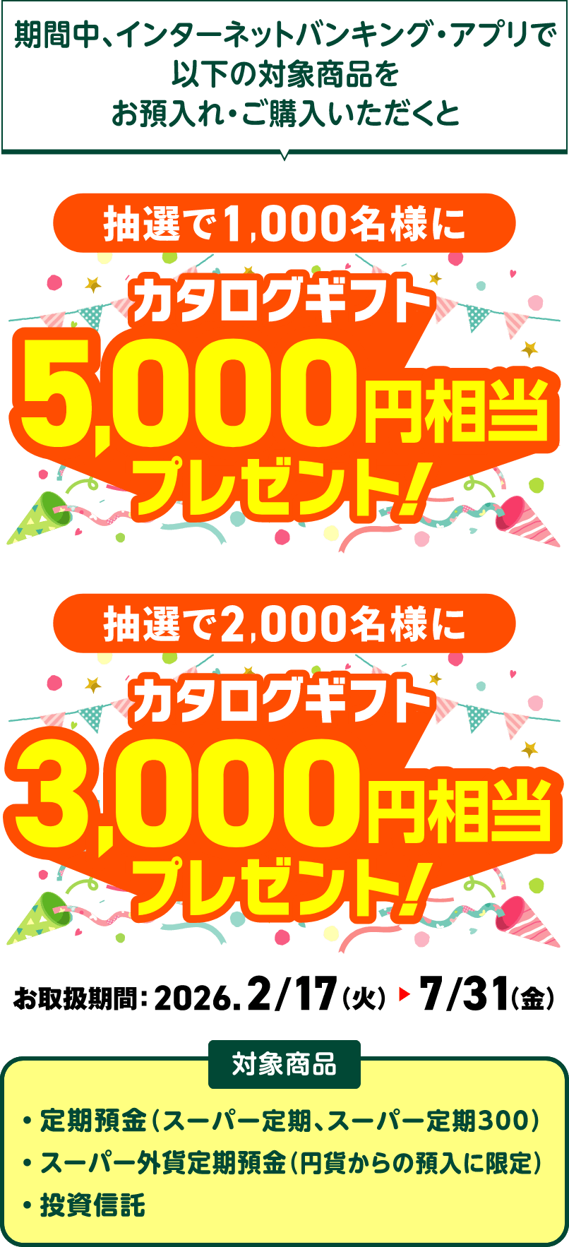 - 期間中、インターネットバンキングで対象商品をお預入れ・ご購入された方