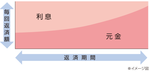 元金を均等割にした額に利息を上乗せしたものを支払う返済方法です。この方式だと、最初の返済額が多くなりますが、返済が進むと額が減少していきます。元利均等返済に比べると利息の返済総額が抑えられます。