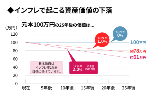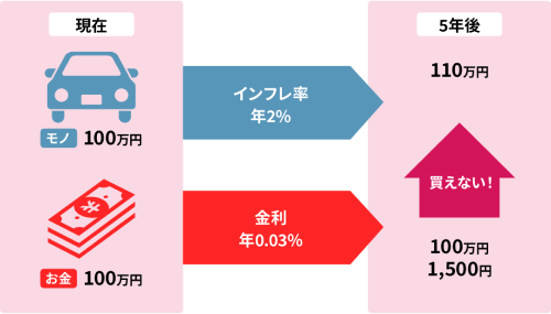 また、バブル崩壊後の1990年代後半以降は低金利が続いているため、預金をすることによる利息収入には期待ができません。現在は預金のみでは殆ど資産が増えないうえに、モノの価値が上昇しているのです。例えば、インフレ率を2%と想定した場合、現在100万円で買えるものが、5年後には約110万円へと値上がりし、同じ金額では買えなくなってしまいます。