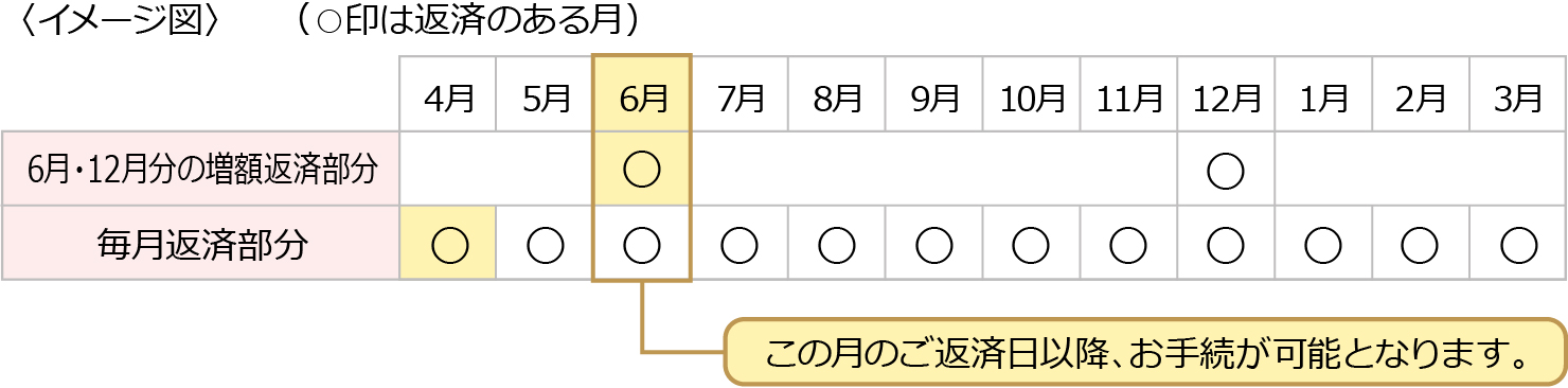 お借入後、初回のご返済(ボーナス月増額返済をご利用されている場合は初回の増額返済)が終了した日以降となります。なお、ボーナス月増額返済が6ヵ月間隔ではない場合は、2回分の返済が終了した日以降となります。