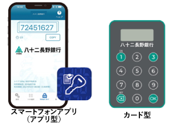 アプリ型とカード型の2種類があります。アプリ型は、『取引認証』と『ワンタイムパスワード』が利用可能です。カード型は、『ワンタイムパスワード』のみ利用可能です。