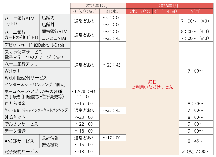 | 八十二銀行ATM(※1) | 店舗内 | 通常どおり | ~21:00 | 終日ご利用いただけません | 7:00~(※3) | |||