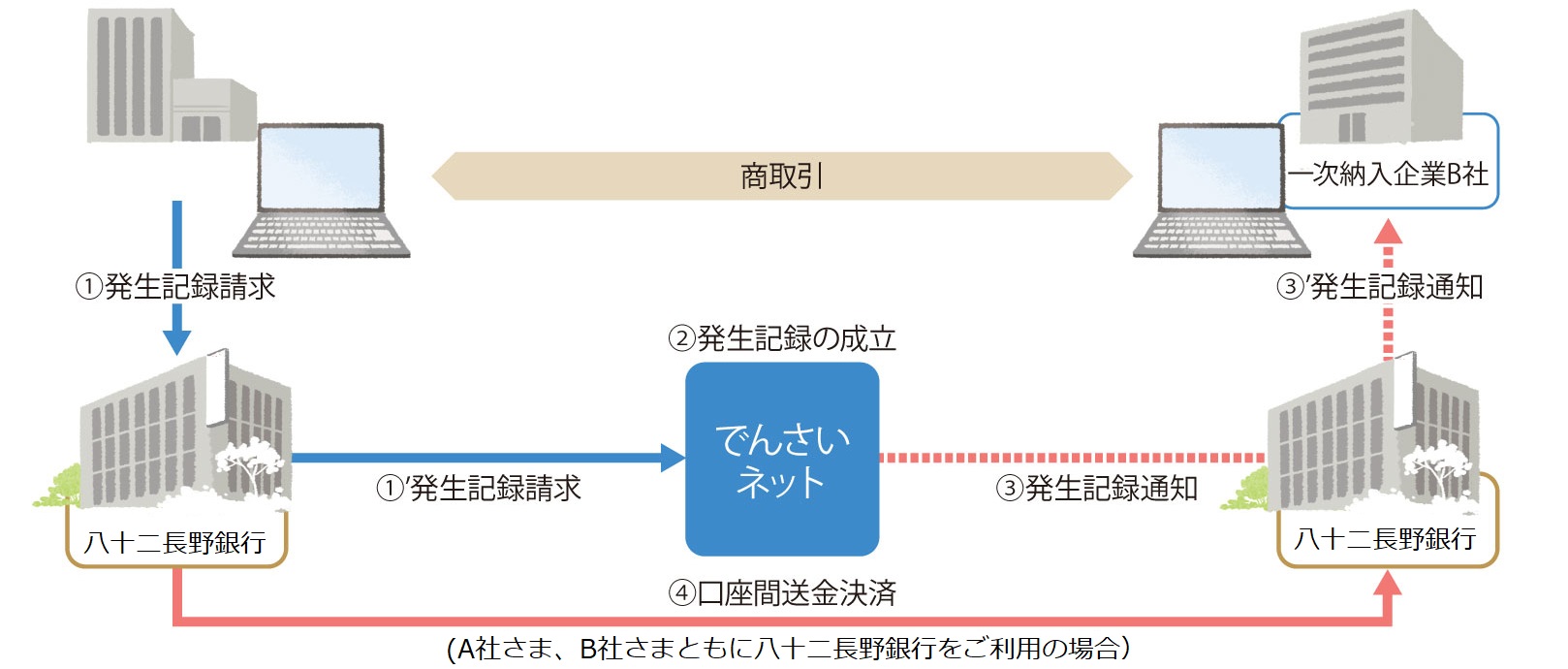 支払企業A社が「でんさいネット」に発生記録請求を行い、「でんさいネット」による発生記録の成立後、一次納入企業B社を受取人とする「でんさい」が発生します。