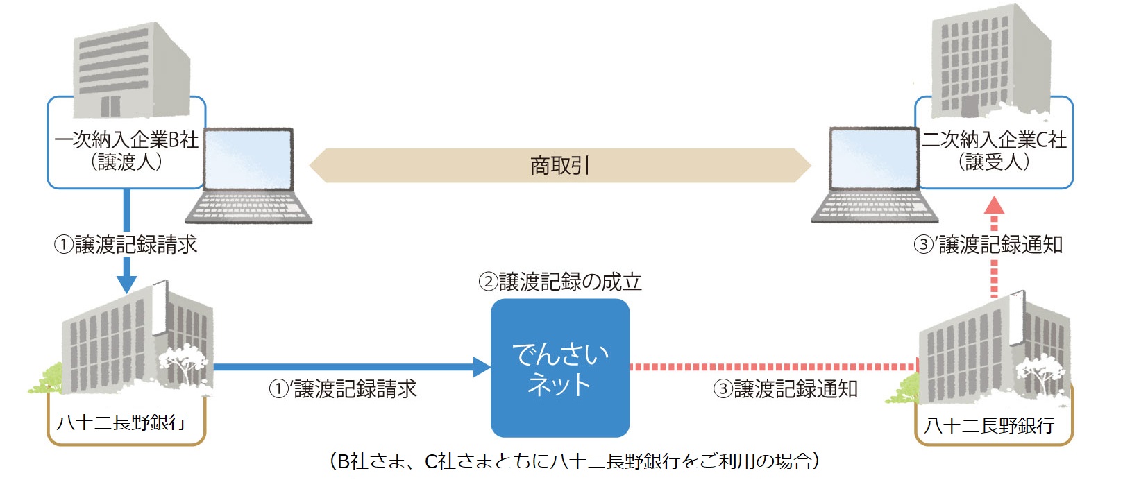 一次納入企業B社(依頼人)が保有する「でんさい」を八十二長野銀行で割引する場合