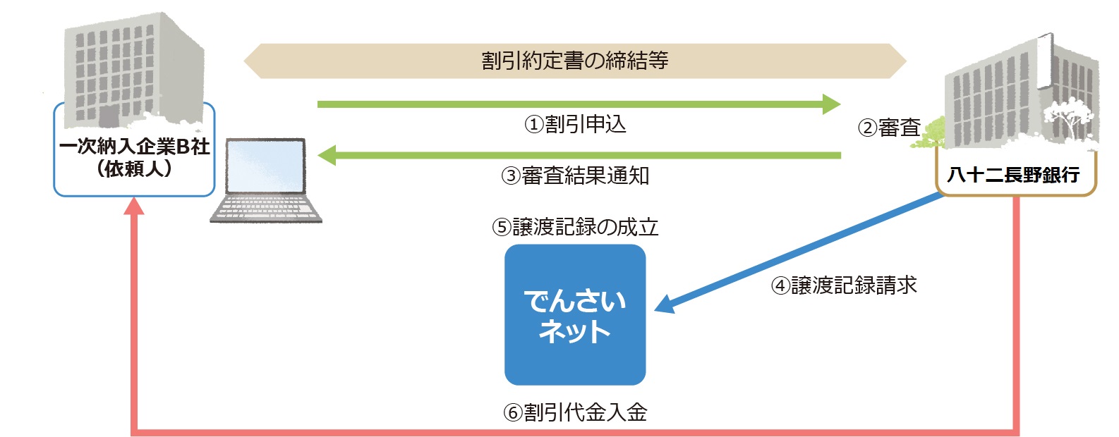 一次納入企業B社(依頼人)が八十二長野銀行に割引申込を行い、割引申込に対する八十二長野銀行の審査および「でんさいネット」による譲渡記録の成立後、一次納入企業B社(依頼人)のご指定口座に割引代金が入金されます。