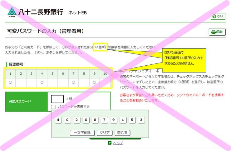 - ログオン時に「確認番号」4桁を入力いただくことはありません。