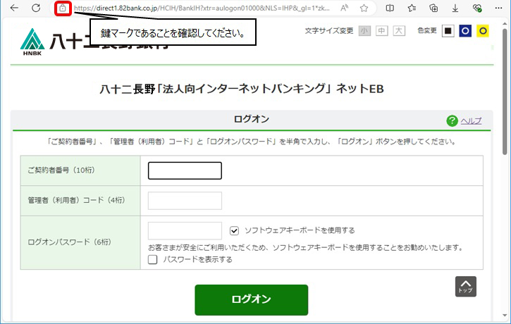 八十二長野銀行のインターネットバンキングは常にSSLで暗号化された通信を行い、ブラウザ画面に「鍵マーク」が表示されます。ここをクリックすると、発行先の証明書へのリンクが表示されますので、発行先を確認してください。