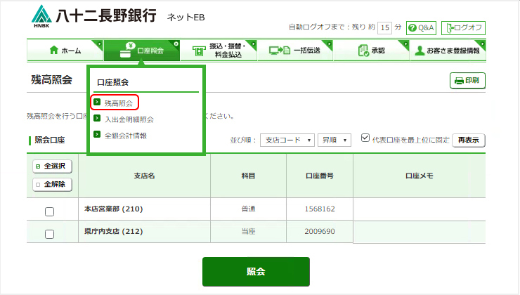 上部メニューの「口座照会」「残高照会」をクリックしてご確認ください。