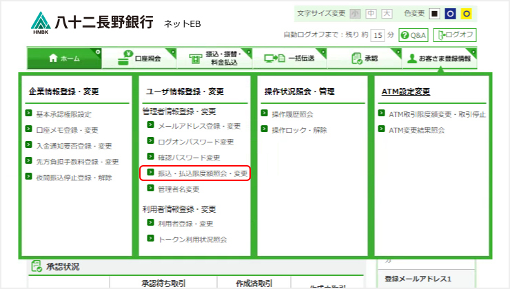 上部メニューの「お客さま登録情報」「ユーザ情報登録・変更」「振込・払込限度額照会・変更」をクリックしお手続きください。