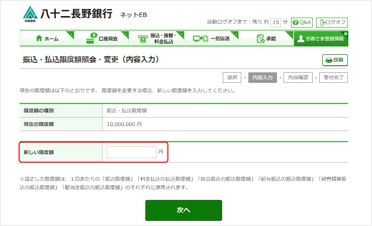 振込・払込限度額の設定