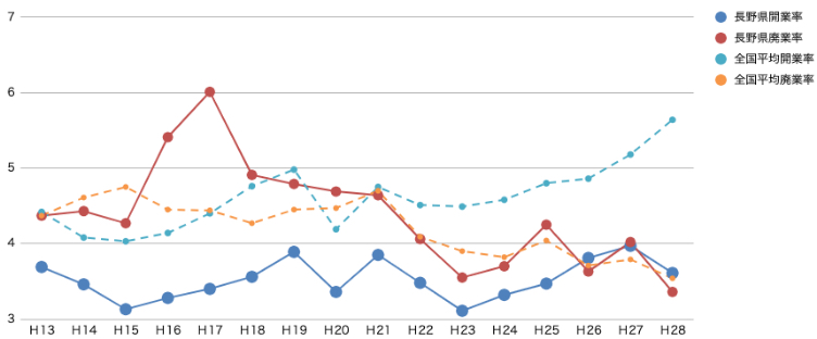 長野県の開業率は、2018年 時点で3.71%。前年の3.61%より伸びてはいますが、全国平均の5.55%を大きく下回り、都道府県別のランキングでは37位です。