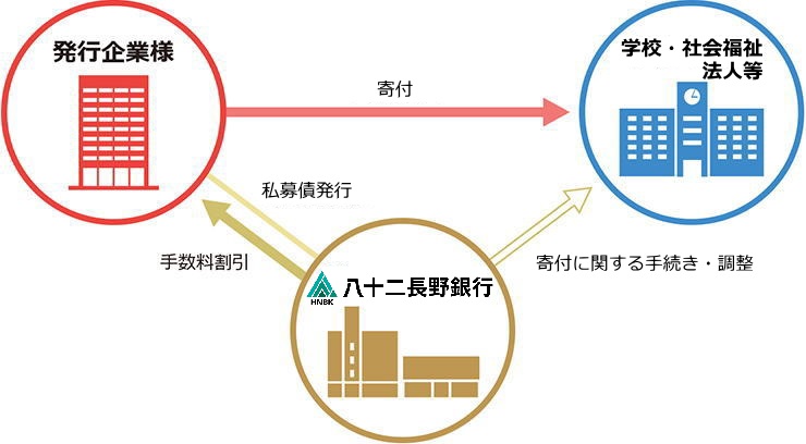| 寄付の仕組み | 私募債発行に際して当行が受取る引受手数料の一部(発行金額×0.2%)を、当行から長野県に寄付致します。 | ||||||||||