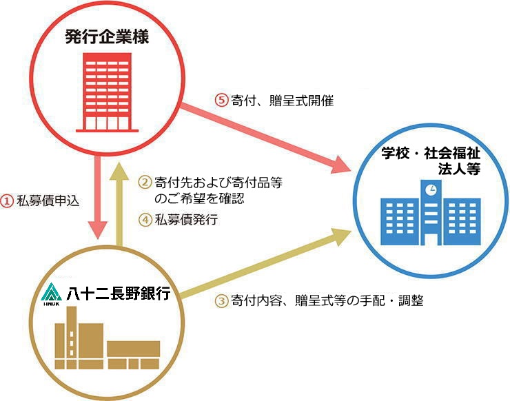 | 寄付者 | 私募債発行企業様 ※寄付に関する手続きは全て当行が代行します |
