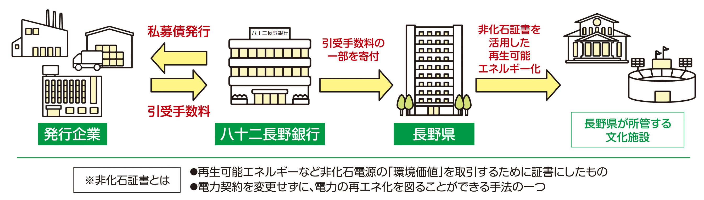 本私募債発行に際し、当行は発行企業様から受取る引受手数料の一部を長野県に寄付いたします。寄付金は長野県が実施する脱炭素化社会実現に向けた各種取組に活用されます。発行企業様は、本商品の利用を通じて地域の脱炭素化を応援することができます。