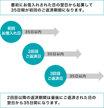 ❷35日ごとの返済お借入れした翌日から35日以内、2回目以降は返済翌日から35日以内にご返済する方法になります。
