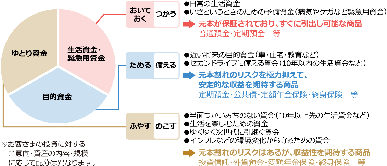 目的や期間に応じて、お金を「おいておく」「ためる」「ふやす」の3つの性格へ振り分けましょう。