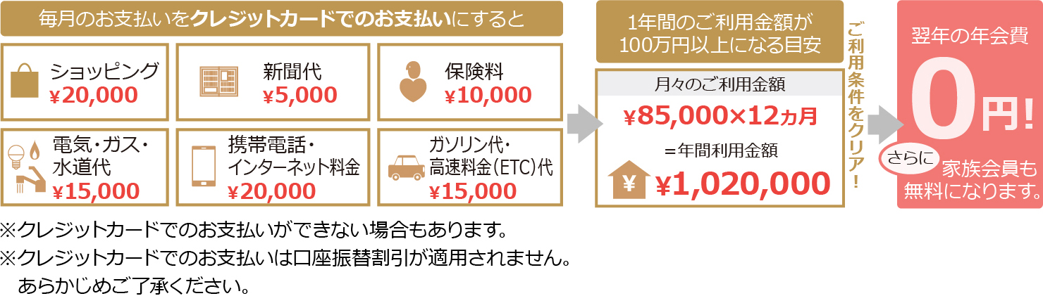 年会費のお支払月から翌年の年会費お支払月前月までの「クレジットカードご利用代金明細書」に記載されたショッピング・キャッシングご利用合計金額が100万円以上の場合、翌年の年会費が家族カード分も含めて無料となります(初年度は年会費をご負担いただきます)。