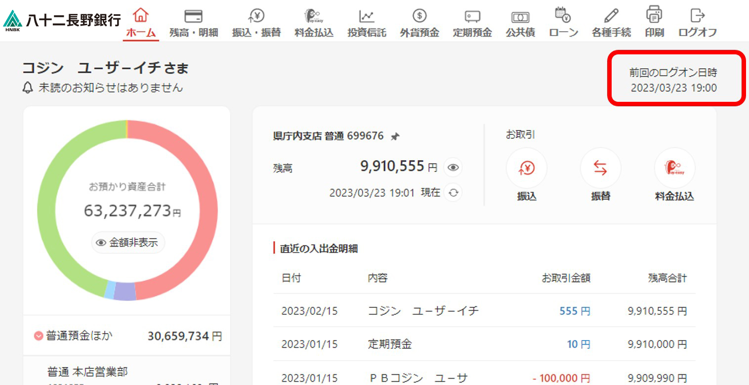 ログオンした際、前回のログオン日時が確認できますので、第三者のなりすましによる不正アクセスのチェックが可能です。
