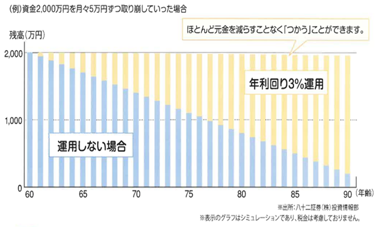 人生100年時代に備えるために、リタイア後は資産の運用を継続しながら、取り崩していくことで、「資産寿命(=資産がなくなるまでの期間)」を長くすることが重要です。その為にはお金をさまざまな特徴をもつ金融資産にバランスよく色分けをすることがポイントです。八十二長野銀行ではお客さまのお考えにあわせたポートフォリオを提案いたします。