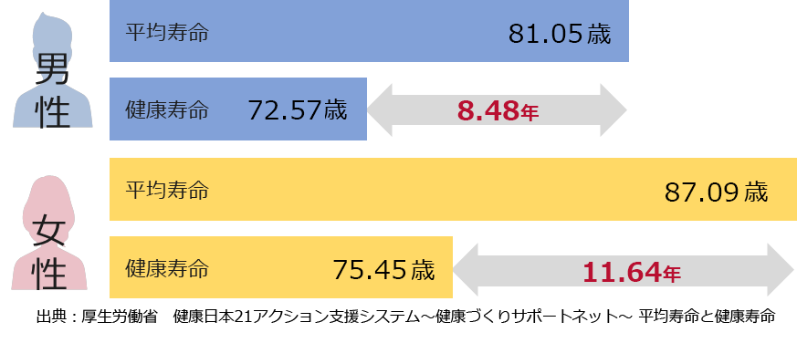 平均寿命と健康寿命の差の期間は以下の図のようになります。人生の終盤においてこれだけの年数が、通院や介護が必要になってくる期間と考えられます。