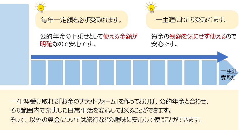 老後の資金の受取り方法として終身年金という仕組みを持っておくとどんなに長生きしても一生涯お金を受取る仕組みができます。