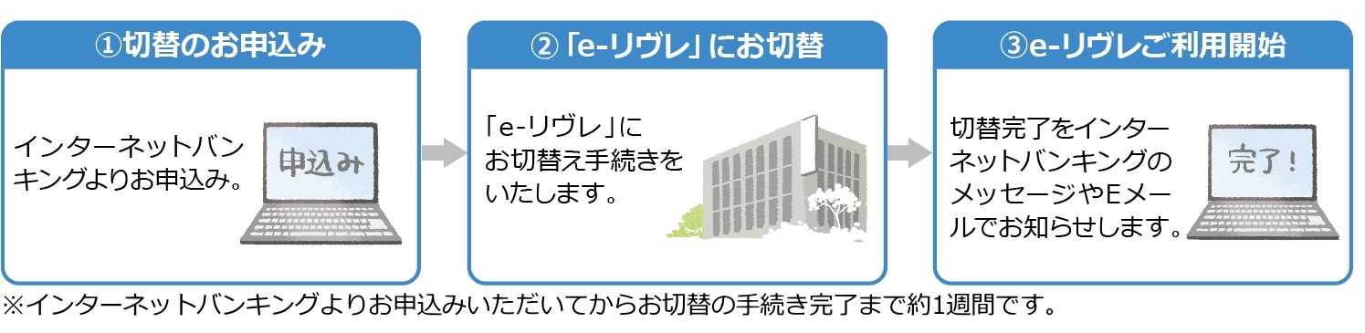- インターネットバンキングでのe-リヴレ口座の取引明細照会等のサービス利用開始時期は、e-リヴレへのお切替手続き日の翌日以降となりますが、e-リヴレへの切替申込口座の状況やインターネットバンキング契約状況により異なりますので、お申込みの際に当行本支店窓口にてご確認ください。