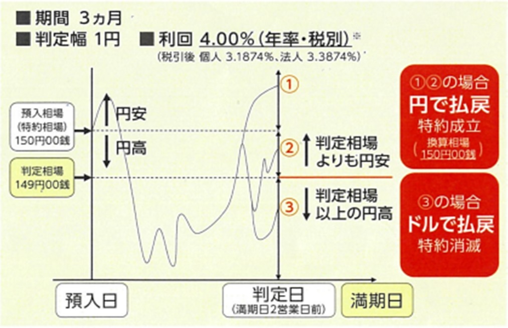 本商品は為替リスクを内包する外貨預金商品です。判定結果によっては、受取額が当初払込額を下回り、「元本割れ」となることがあります。