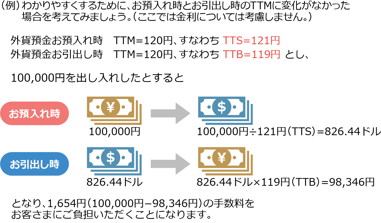 お預入れ時とお引出し時の為替相場(TTM)に変動がなかったとしても、TTSとTTBの差(米ドルの場合2円、ユーロの場合3円、通貨によって異なります)がお客さまのご負担となります。