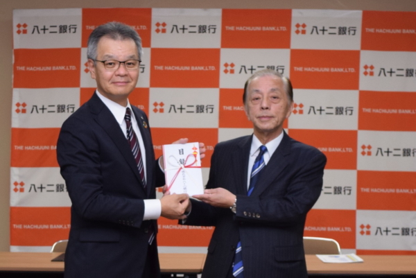 - 2023年8月3日から8月30日まで販売した寄付スキーム付仕組債「はちにのスマイルボンド(コール条項付)2023-08」の販売金額に応じた当行収益の一部を、2024年3月12日(火)、認定NPO法人 フードバンク信州へ寄付しました。