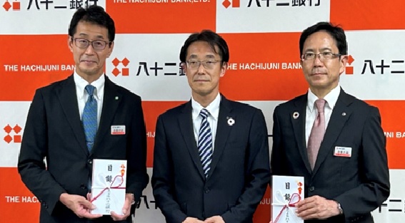 - 2024年8月6日(火)に2023年8月から2024年3月に販売した寄付スキーム付仕組債「はちにのスマイルボンド(コール条項付)」の販売金額に応じた当行収益の一部を長野県立こども病院、日本赤十字社長野県支部へ寄付しました。