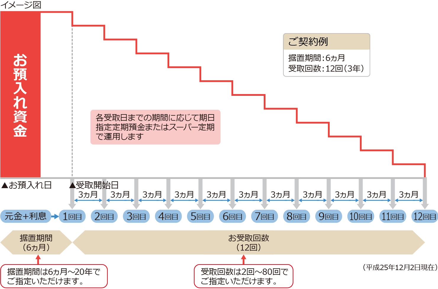 | 払戻方法 | 受取口座および受取開始日(預入日から6ヵ月以上20年以内の任意の日)をご指定いただき、指定日以降3ヵ月毎に受取口座に払戻しいたします。 |