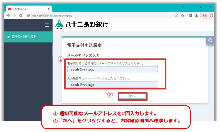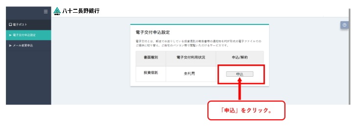 八十二長野<インターネットバンキング>にログオンし、<電子交付サービス>をクリックします。(店頭でのお手続きは不要です。)