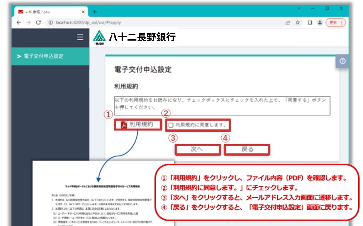 八十二長野の電子交付サービス規定(利用規約)の内容を確認し、次画面へ進みます。