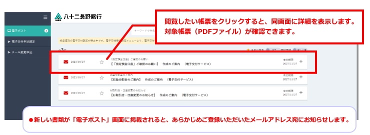 八十二長野<インターネットバンキング>にログオン後、<電子交付サービス>をクリックすると、「電子ポスト」画面が表示され、交付された書類が閲覧できます。