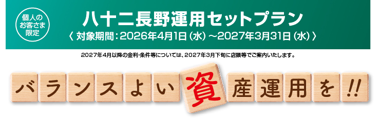 期間中でも金利情勢等によっては事前の告知なく金利・期間を変更またはプランを中止することがあります。 詳しくは、窓口にお問い合わせください。