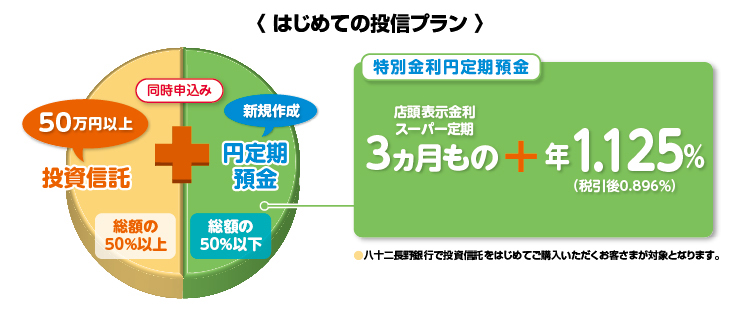 - 八十二長野銀行(合併前の八十二銀行および長野銀行を含む)で投資信託をはじめてご購入いただくお客さまが対象となります。