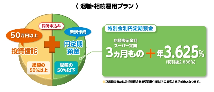 退職・相続運用プランの満期金で当行取扱商品「セカンドライフプラン」「相続定期預金プラン」をお申込みいただくことはできません。