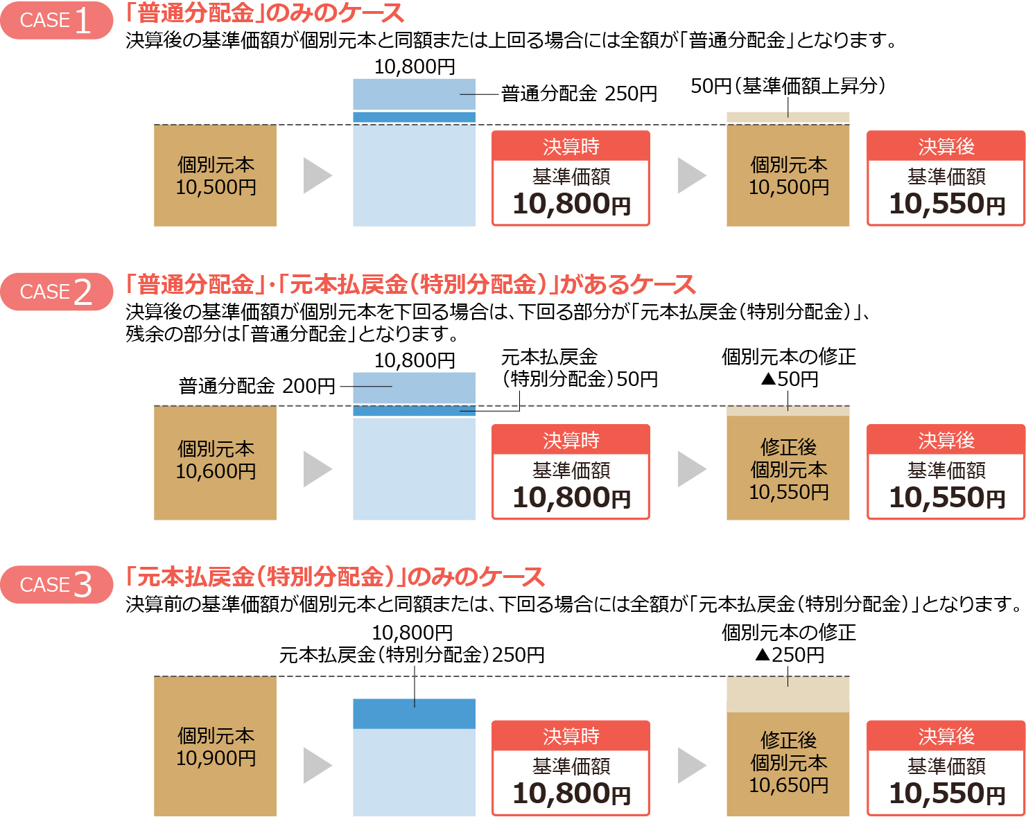 - 「元本払戻金(特別分配金)」が支払われた場合は、その金額だけ個別元本および取得価額が減額調整されます。