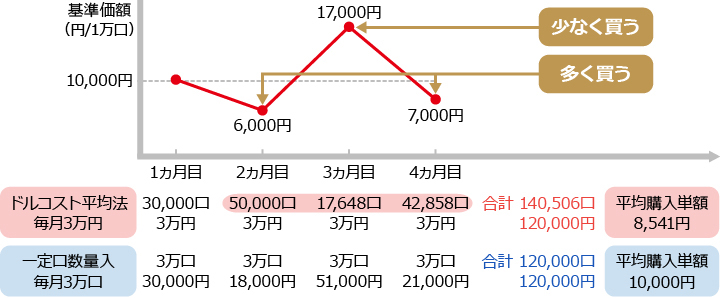 一回にまとめて外貨を購入する場合、高い為替相場で購入してしまう可能性がありますが、毎月一定額を購入していけば、高いときに買いすぎたり、低いときに買いそこなうことを防ぐことができます。この結果、一回にまとめて購入するよりも、購入コストが長期的に安定し、投資タイミングによるリスクの軽減が期待できます。