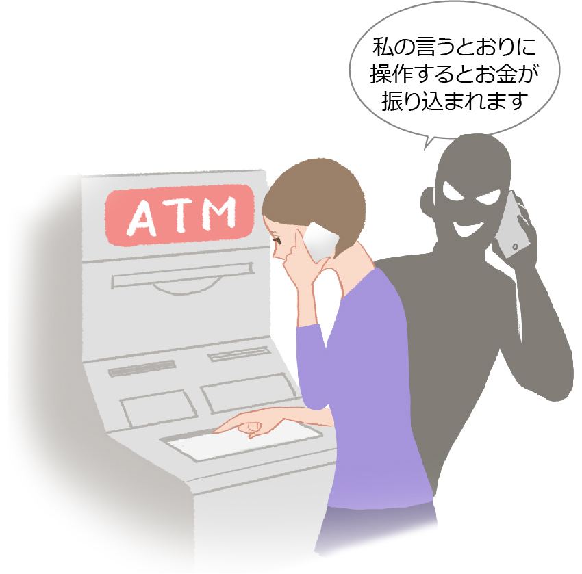 税務署や市役所、社会保険事務所あるいは銀行職員などをかたり、税金・医療費・年金などの還付手続きの口実でATM(多くは無人のATM)へ行くよう誘導し、電話でATMの操作を指示して、振り込ませる手口です。