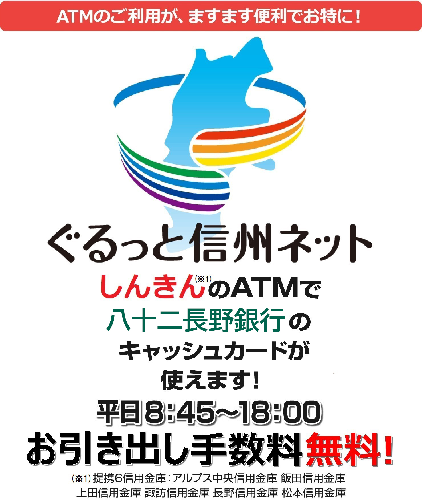 合併に伴うシステム対応のため、2026年1月1日(木)~2026年1月4日(日)は、長野県内提携6信用金庫のATMで八十二長野銀行のクイックカード(旧八十二銀行のクイックカード、旧長野銀行のキャッシュカードを含みます)等をご利用いただけません(詳細は以下のWEBページでご確認ください)。